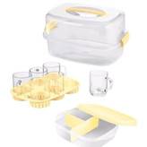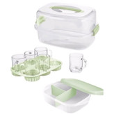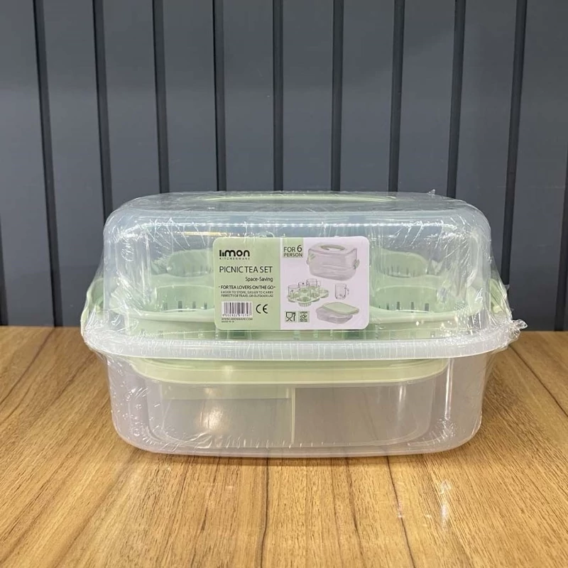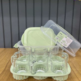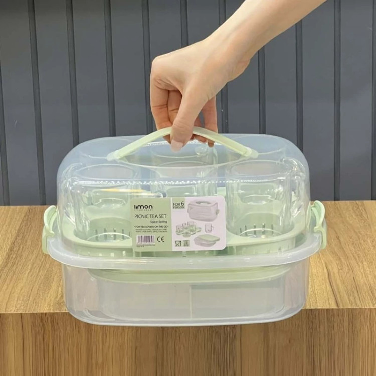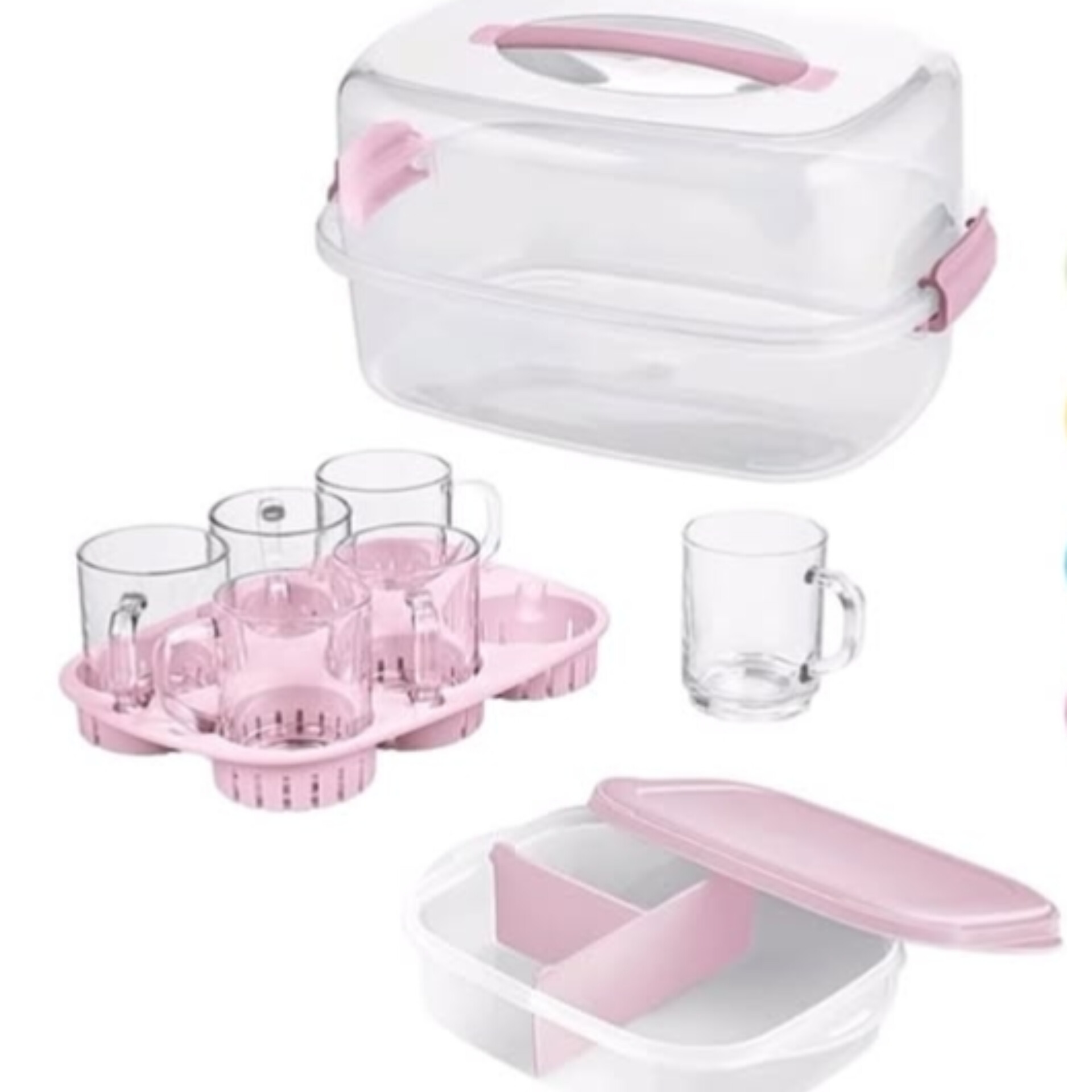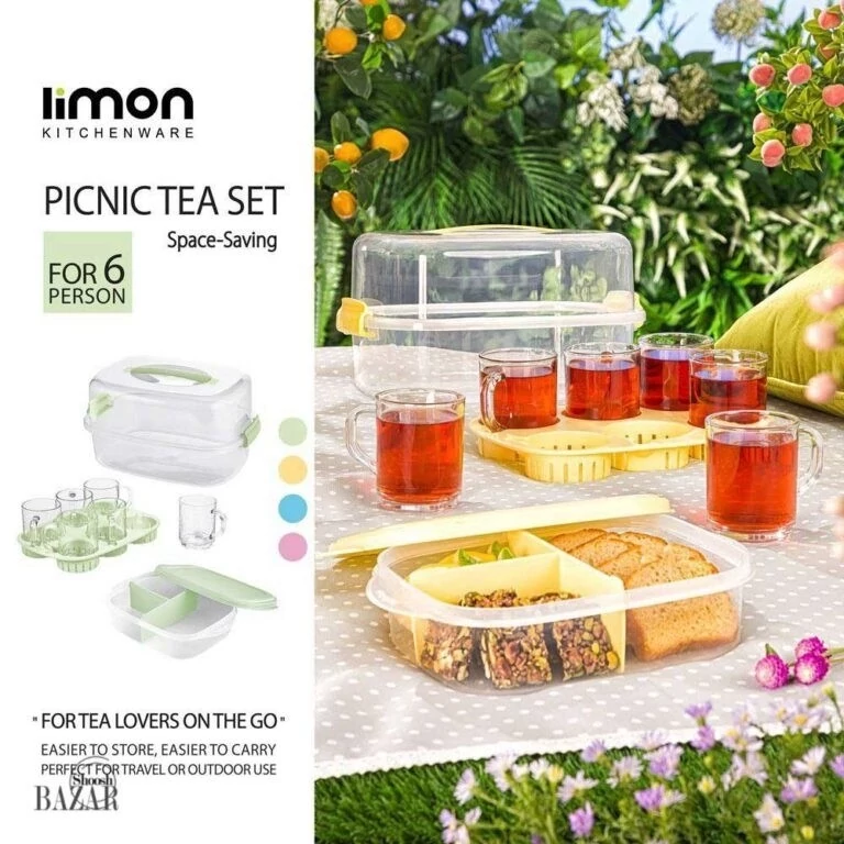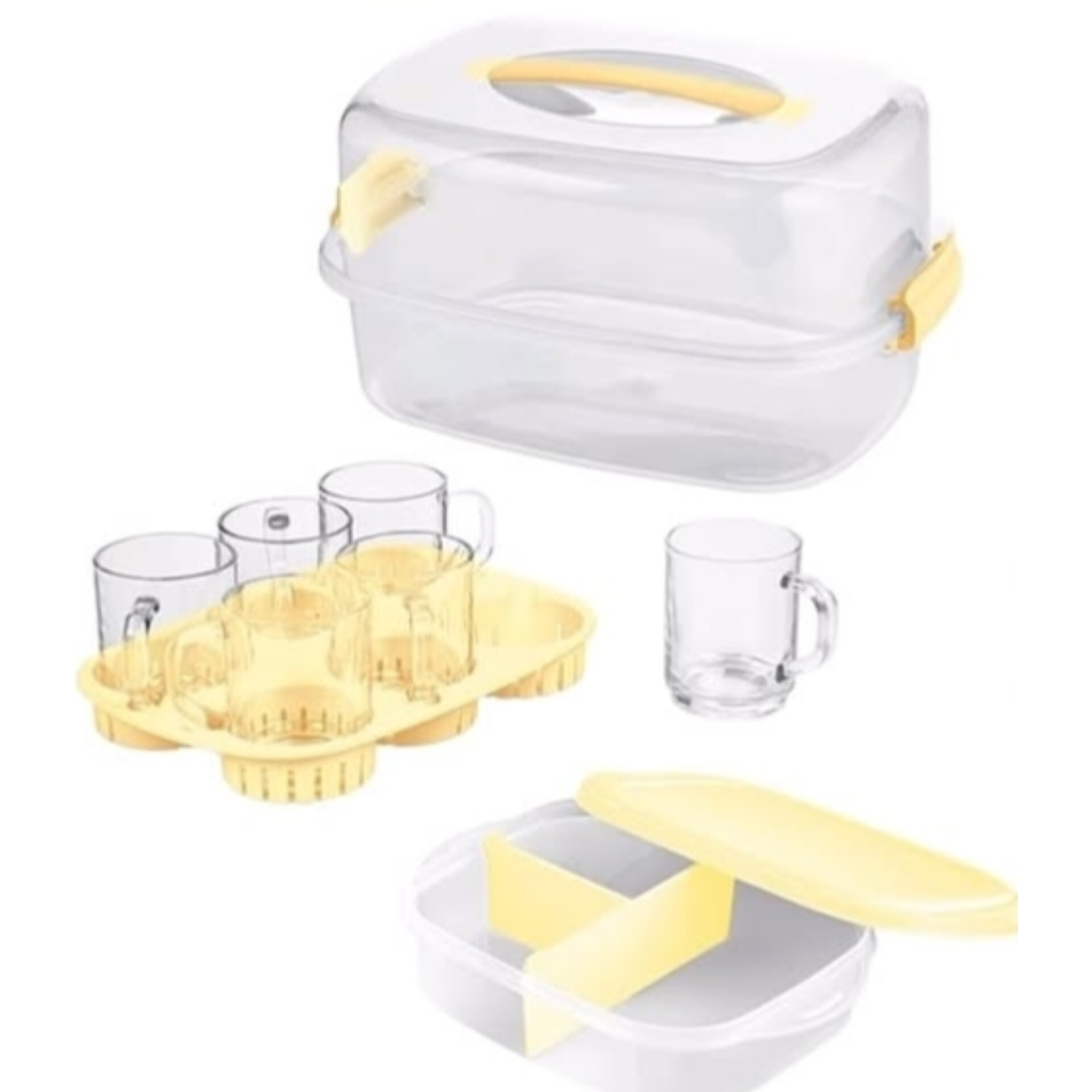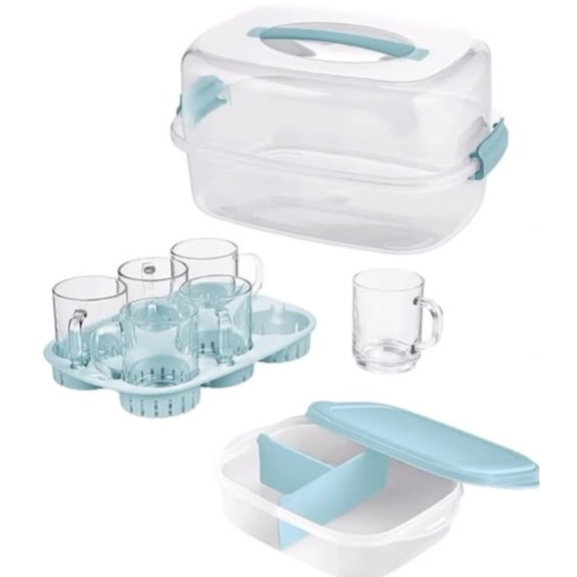 مناسب 6 نفر دارای 6 عدد لیوان شیشه ای دسته دار دارای یک استند برای نگهداری لیوان ها دارای یک ظرف 3 خانه در دار میوه و شیرینی دارای باکس بزرگ حمل محصول رنگبندی پاستیلی: زرد، آبی، صورتی، سبز