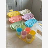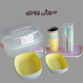 6 عدد لیوان 6 عدد بشقاب 6 عدد کاسه خورشت 6 عدد قاشق ،6عدد چاقو،6 عدد چنگال نمکپاش دوطرفه سبد بزرگ یک سینی پک دوقفله رنگبندی پاستیلی